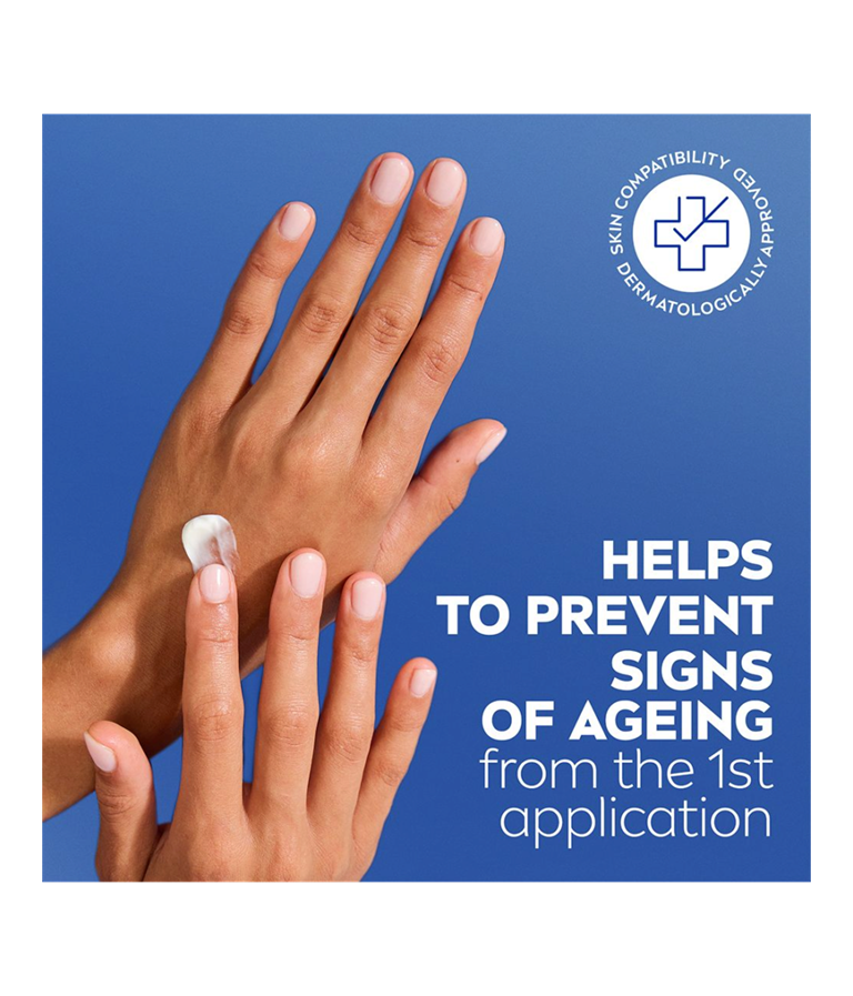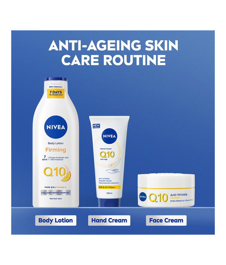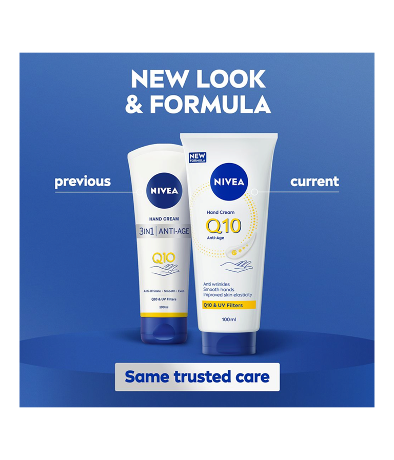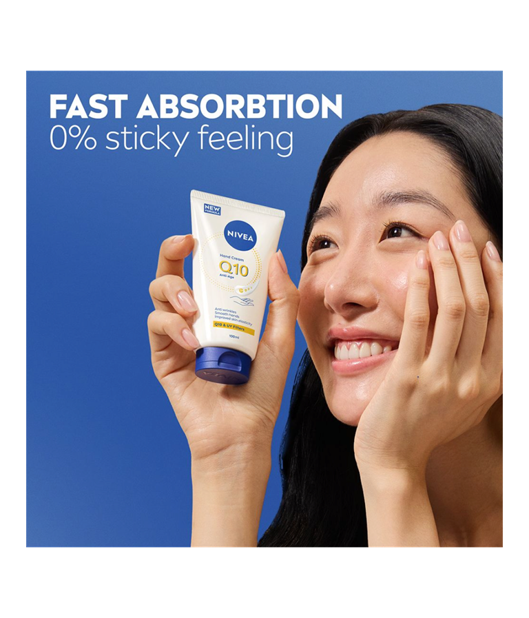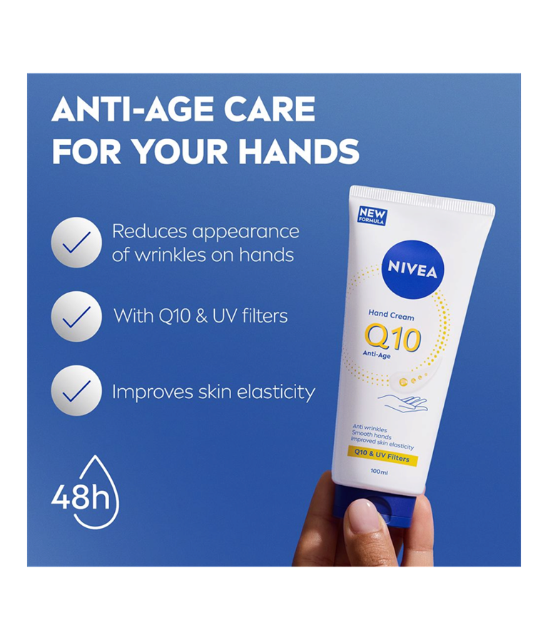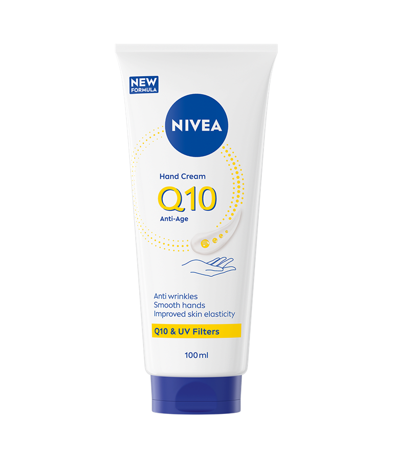 NIVEA Q10 Anti-Age Hand Cream är en återfuktande handkräm med Q10 och UV-filter som motverkar att huden åldras i förtid. Med 24 timmars skyddande vård är detta den perfekta handkrämen för en mjuk och smidig hudkänsla.