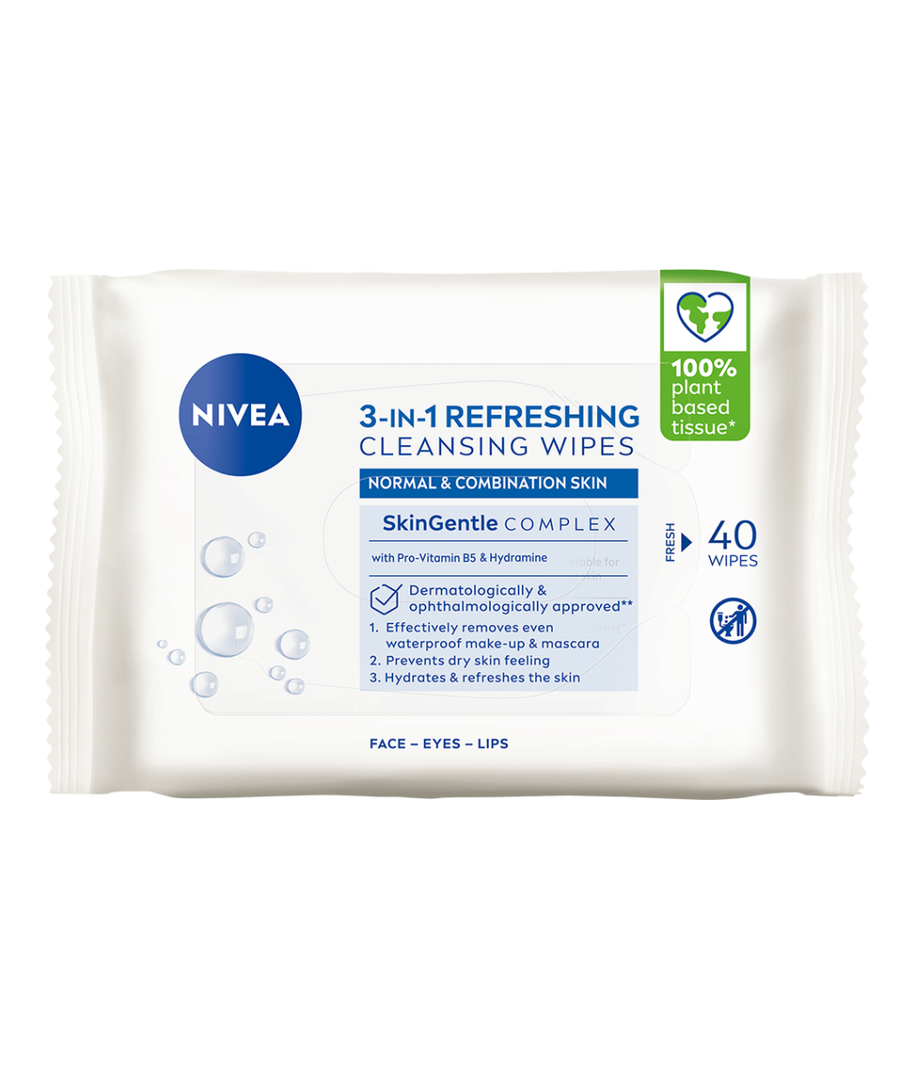 NIVEA Refreshing Cleansing Wipes: uppfriskande växtbaserade rengöringsservetter med SkinGentle-komplex som är snälla mot huden och skyddar dess fuktbalans. Tar effektivt och skonsamt bort vattenfast make-up och mascara och lämnar huden återfuktad | 40 st