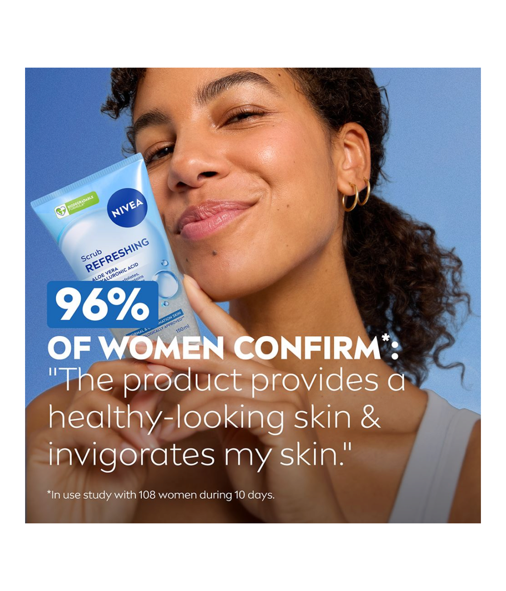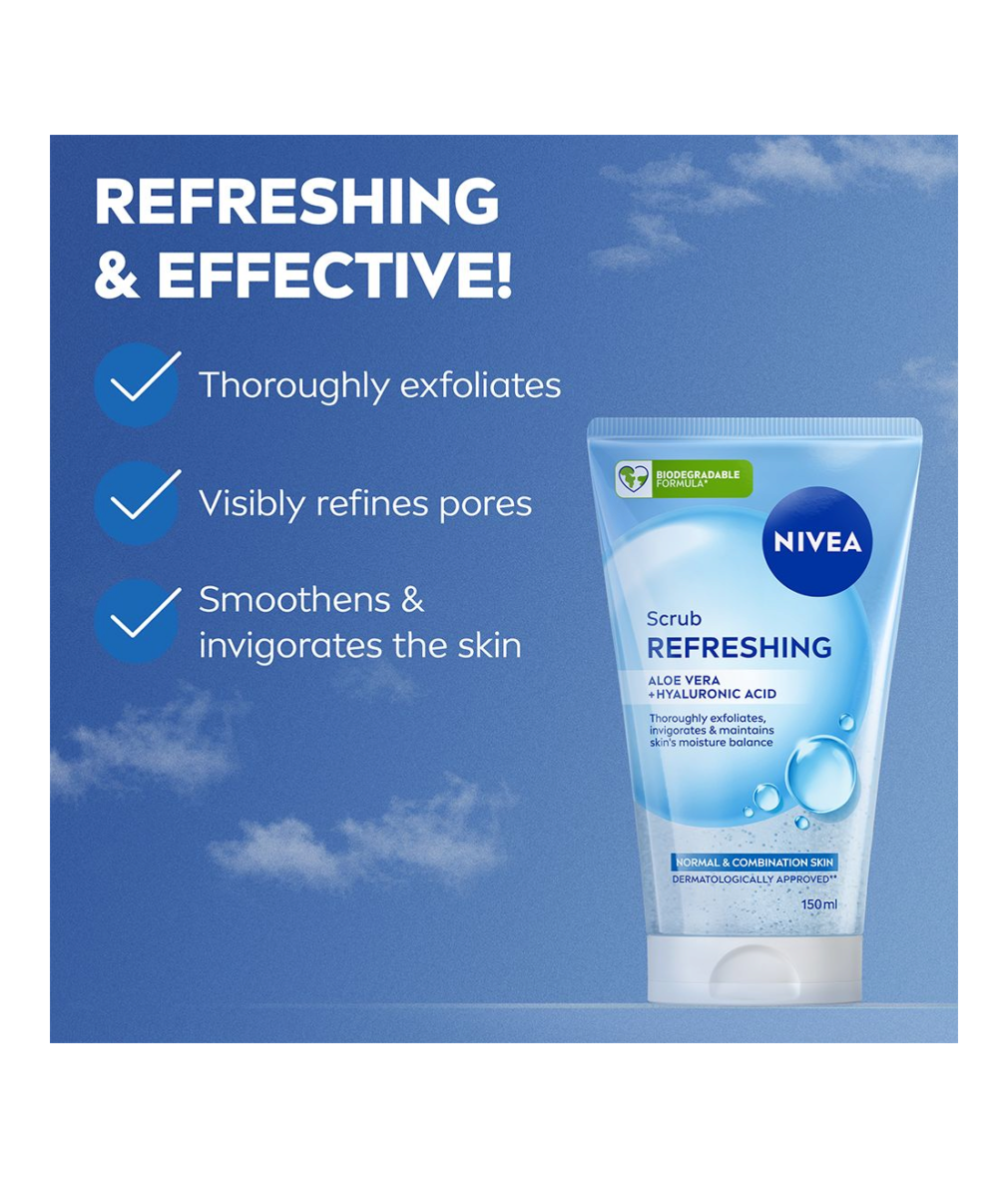 Påbörja din resa mot synligt förbättrad hud med nya NIVEA Refreshing Scrub. Denna uppfriskande peeling skrubbar bort orenheter på djupet samtidigt som den vårdar din hud.