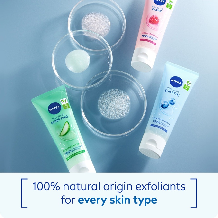 NIVEA Rice Scrub Smooth är en ansiktsskrubb som är berikad med ekologiskt framställda Japonica-risfrön och blåbär. Exfolierar milt och tar effektivt bort döda hudceller utan att irritera huden. Den förfinar huden och lämnar den slät och fräsch.