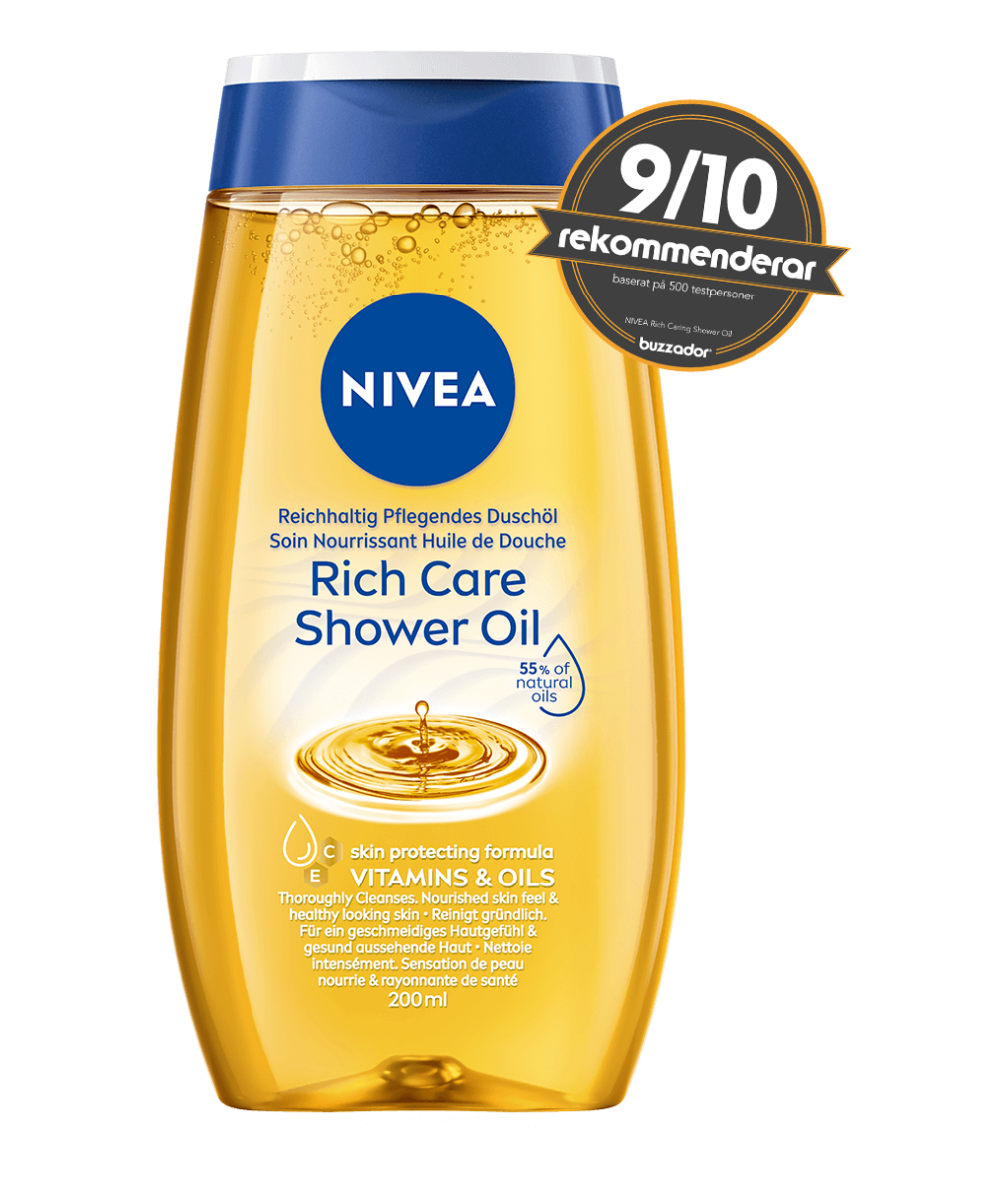 NIVEA Rich Caring Shower Oil är en duscholja som rengör och återfuktar huden. Den har en snäll formulera med vitamin E och 55 % naturliga oljor som kapslar in fukten i huden. Njut av en lyxig doft som glädjer sinnena.