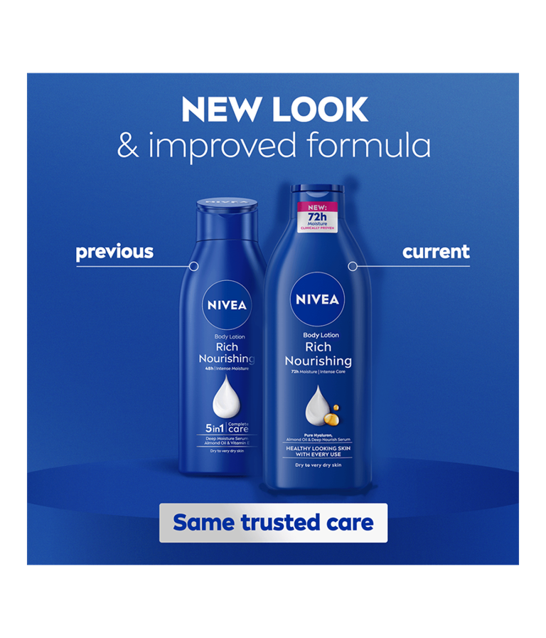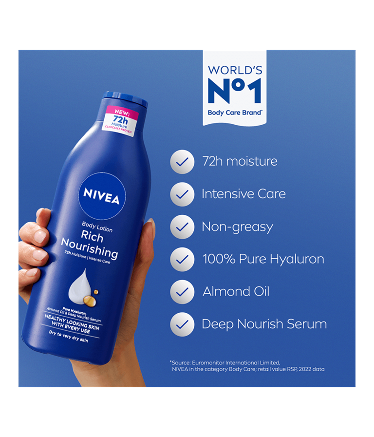 Upptäck Rich Nourishing Body Lotion med ny förbättrad formula för en hud som ser hälsosam ut efter varje användning. Återfuktar i 72 timmar och ger näring på djupet. För märkbart mjuk och len hud. Berikad med hyaluron, mandelolja och djupt närande serum. Icke-kladdig och snabbabsorberande.