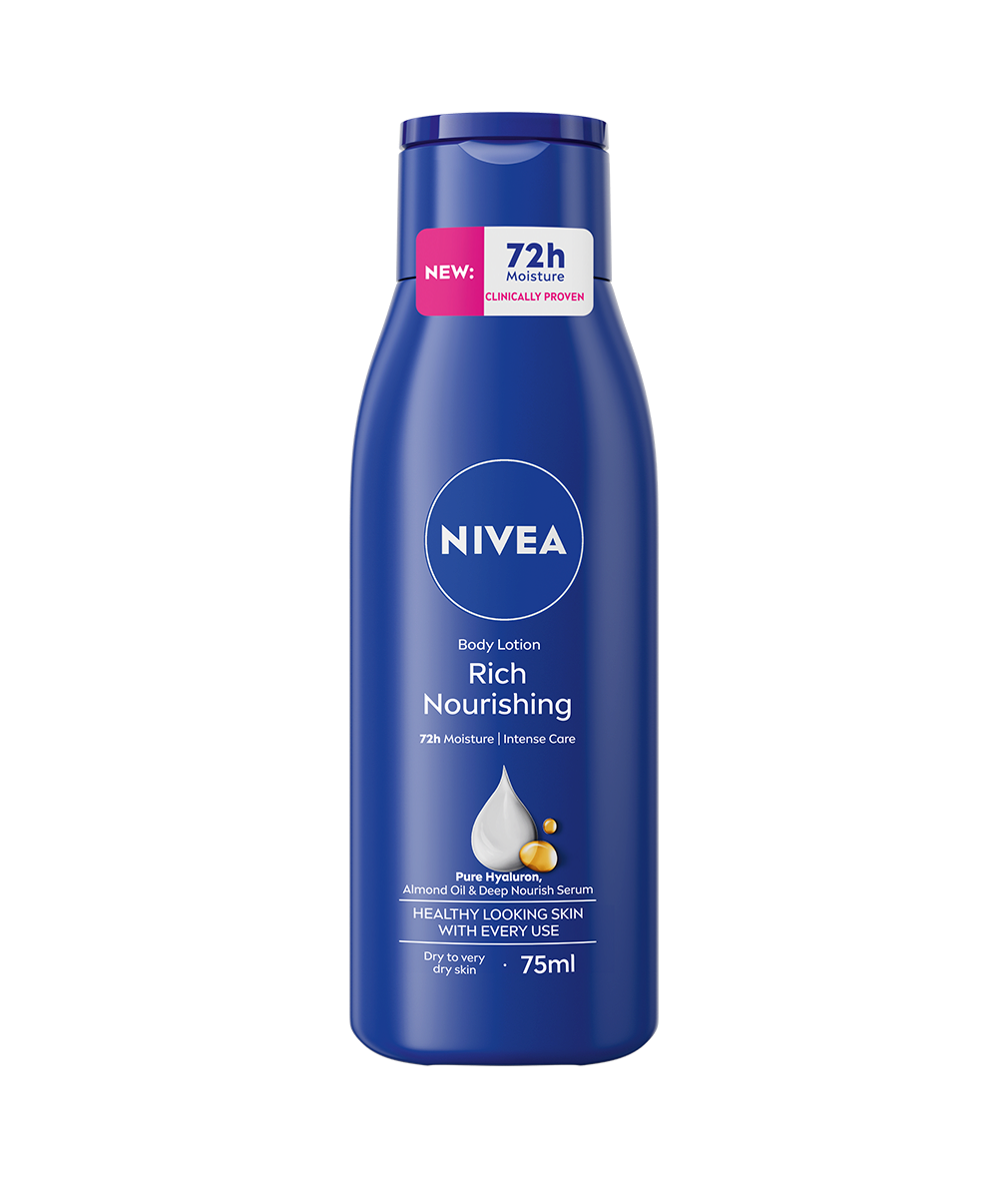 Ge din hud näring med NYA NIVEA Rich Nourishing Body Lotion. Dess förbättrade formula innehåller nu 100% ren hyaluron, mandelolja och Deep Nourish Serum för 72 timmars djup återfuktning och mjuk hud efter varje användning.