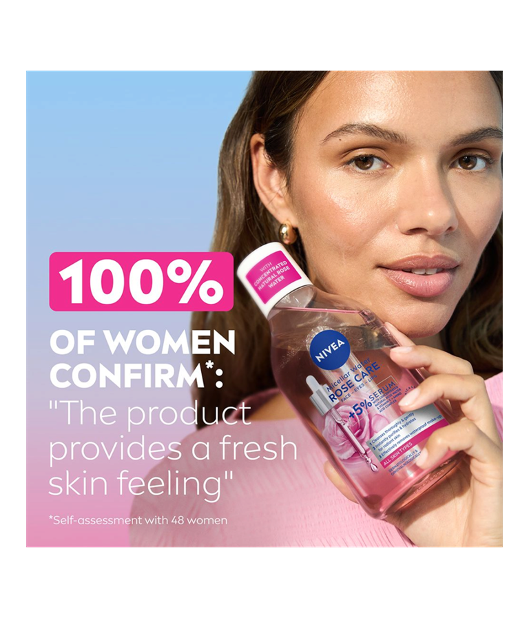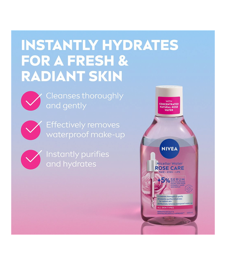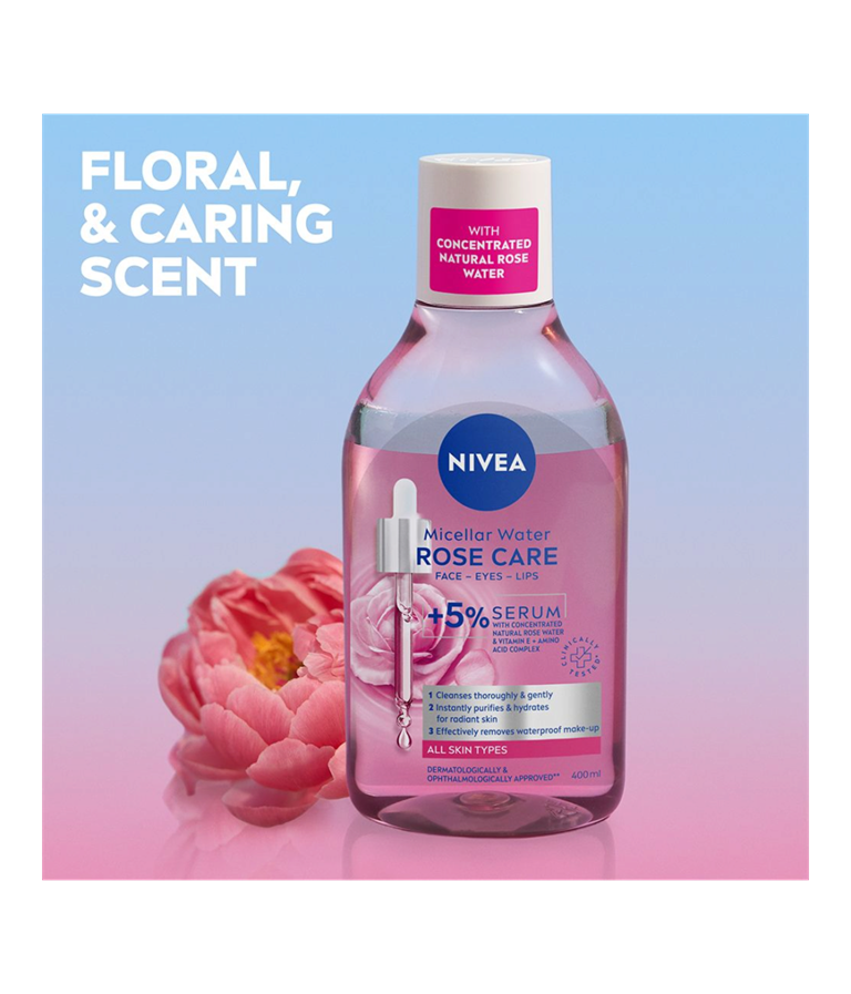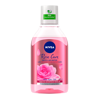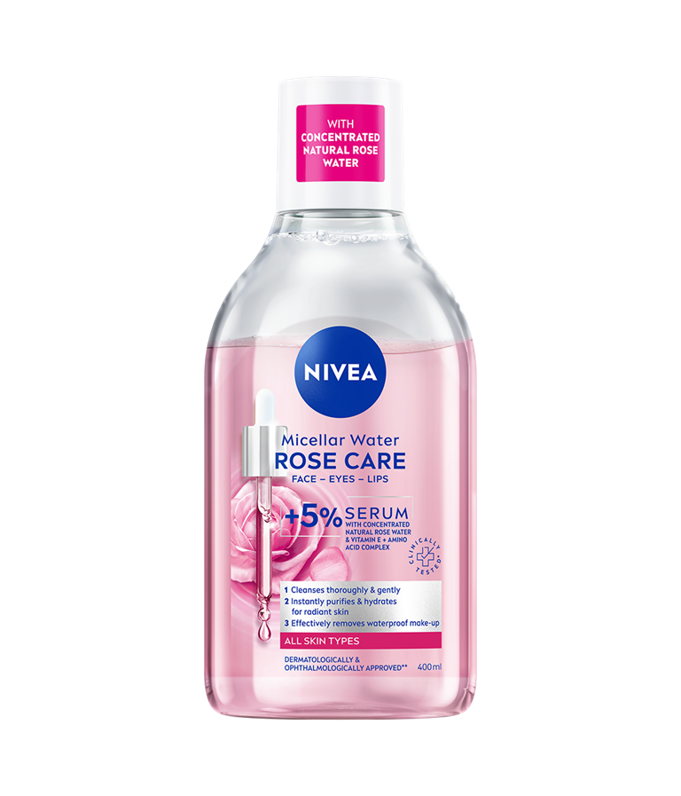NIVEA Rose Care Micellar Water är en effektiv sminkborttagning med olja som avlägsnar vattenfast smink och rengör huden på djupet, utan att lämna en fet känsla. Formulan är berikad med 5% Serum med milt rosvatten som ger en fräsch och uppfriskande känsla. Lämplig för daglig användning. Dermatologiskt och oftalmologiskt testad.