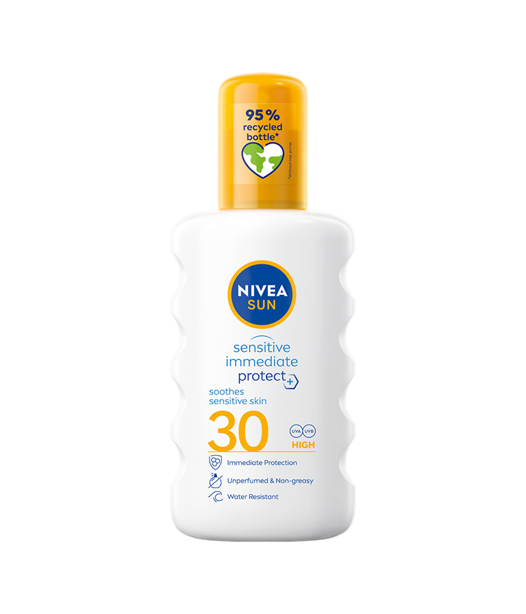 NIVEA SUN Sensitive Immediate Protect Soothing Spray är ett högt solskydd med SPF30 som ger ett omedelbart skydd samtidigt som den lugnar känslig hud med hjälp av Aloe Vera. Formulan är även vattenresistent och parfymfri samt 76% biologiskt nedbrytbar.