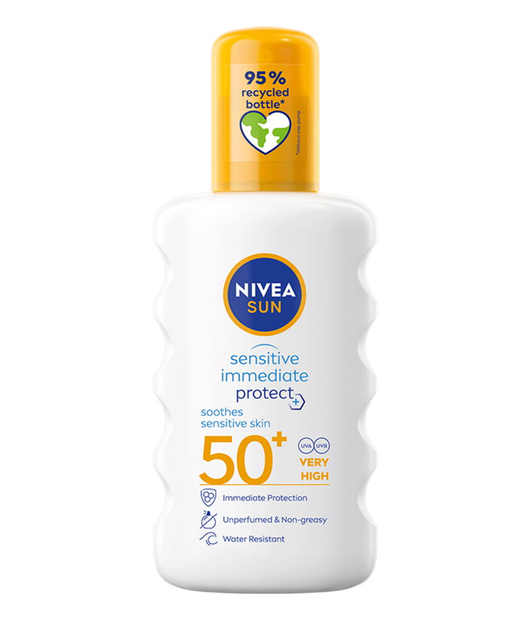 NIVEA SUN Sensitive Immediate Protect Soothing Spray SPF 50+ är ett solskyddsspray som skyddar mot UVA- och UVB-strålar. Berikad med Aloe Vera och lugnar omedelbart känslig hud.