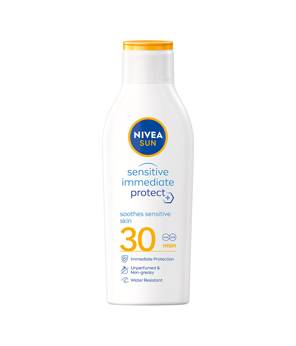 NIVEA Sensitive Immediate Protect Soothing Lotion SPF 30 är en sollotion berikad med ekologisk Aleo Vera och Jojobaolja som skyddar och omedelbart lugnar känslig hud.