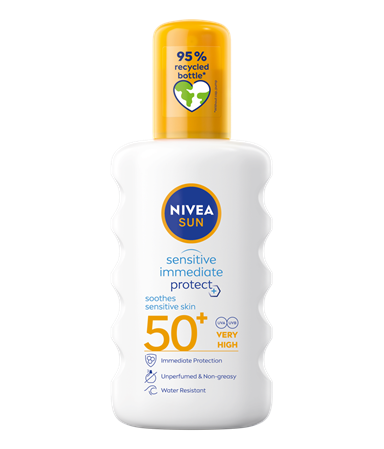 NIVEA SUN Sensitive Immediate Protect Soothing Spray är ett högt solskydd med SPF30 som ger ett omedelbart skydd samtidigt som den lugnar känslig hud med hjälp av Aloe Vera. Formulan är även vattenresistent och parfymfri samt 76% biologiskt nedbrytbar.