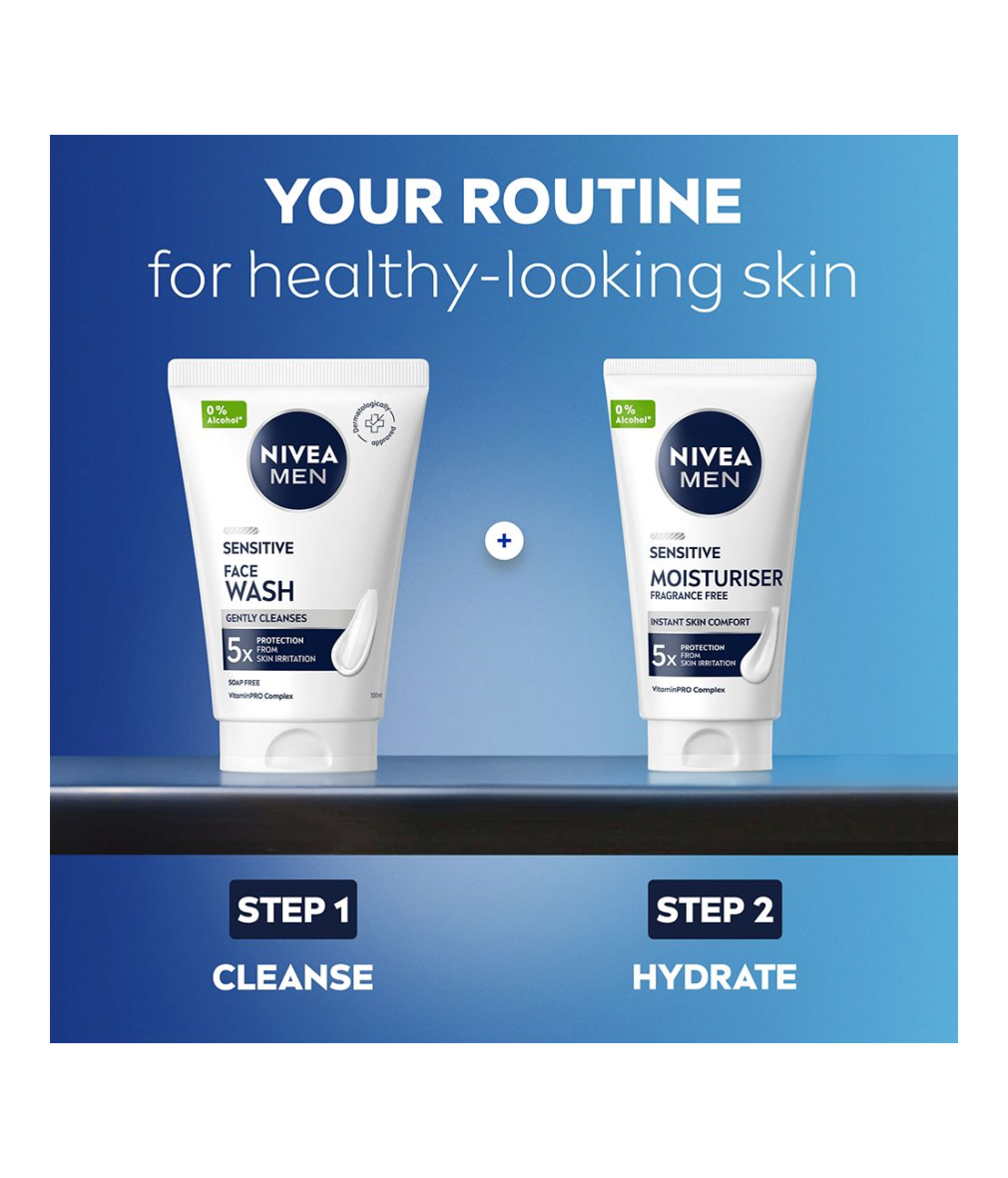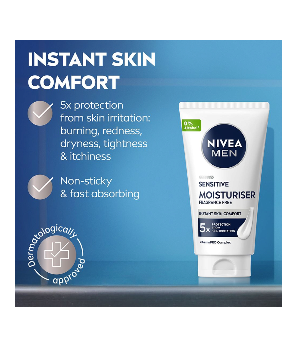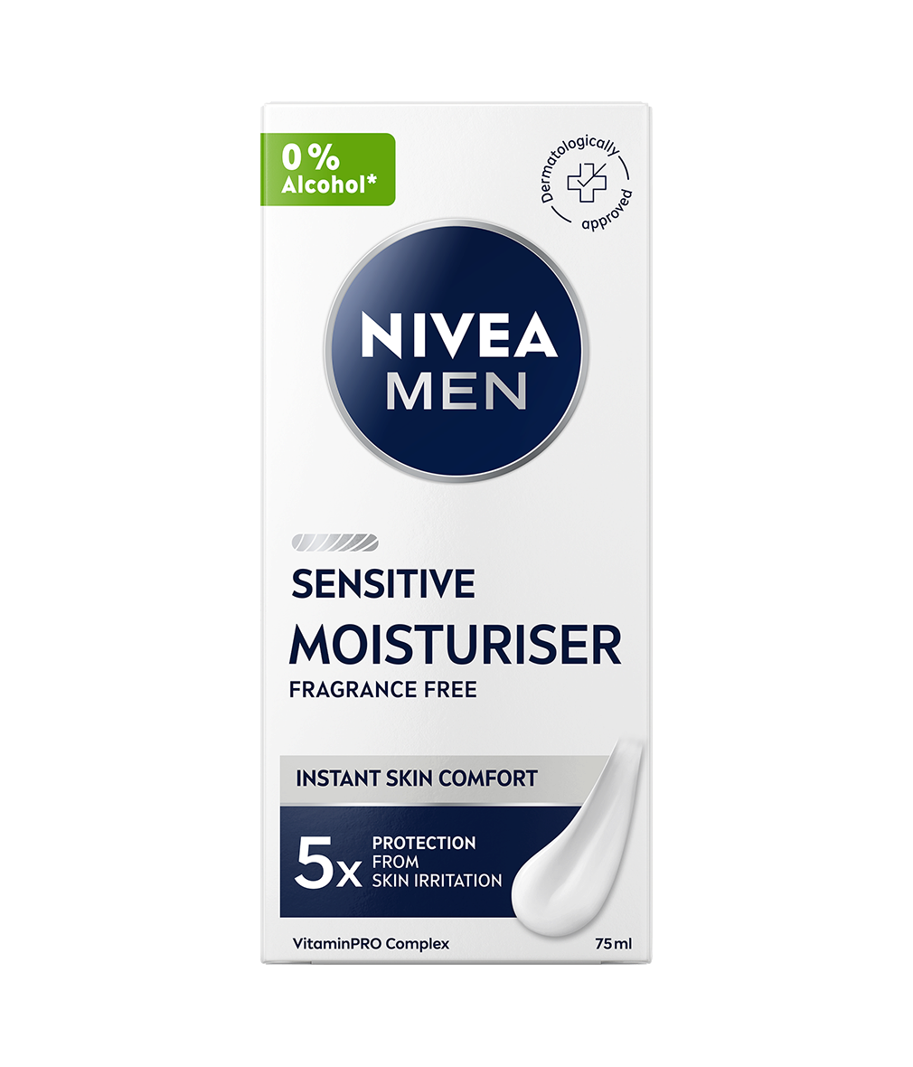 NIVEA MEN Sensitive Moisturiser är en ansiktskräm med 24h återfuktning som är speciellt utformad för att ge långvarig fukt till känslig hud. Den lugnar och ger näring så att huden känns behaglig och fräsch hela dagen!