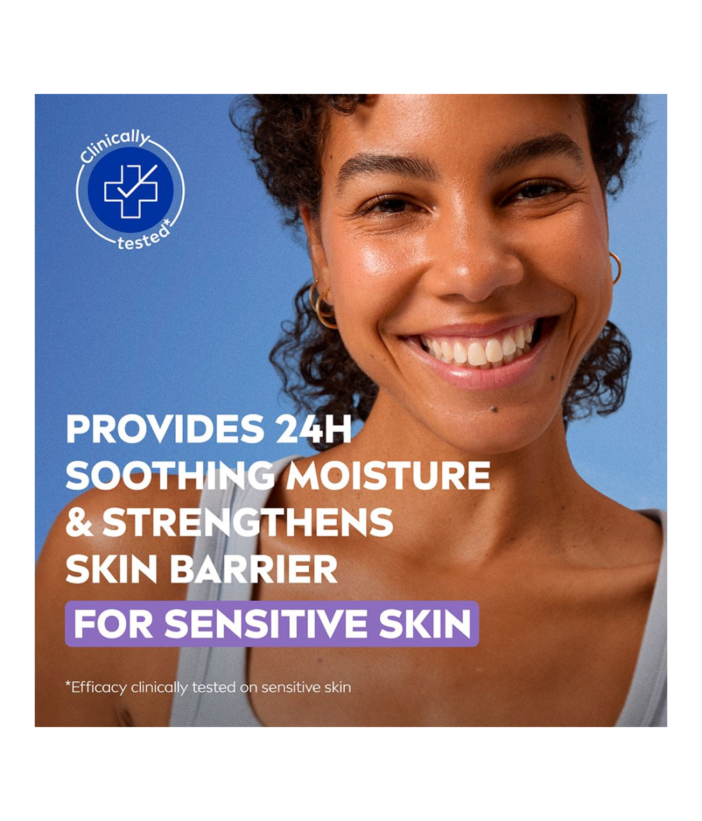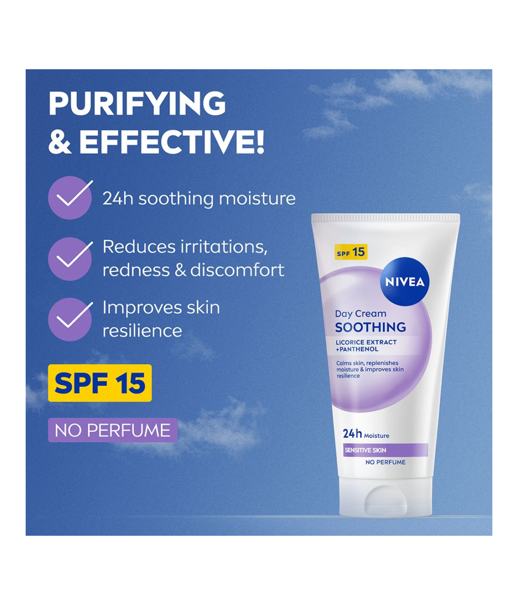 NIVEA Soothing Day Cream är en dagkräm som verkar lugnande och ger huden intensiv återfuktning i 24 timmar samtidigt som den minskar tecken på känslig hud som rodnad, torrhet och stramhet. Formulan innehåller SPF 15 som skyddar din hud från solens farliga strålar.