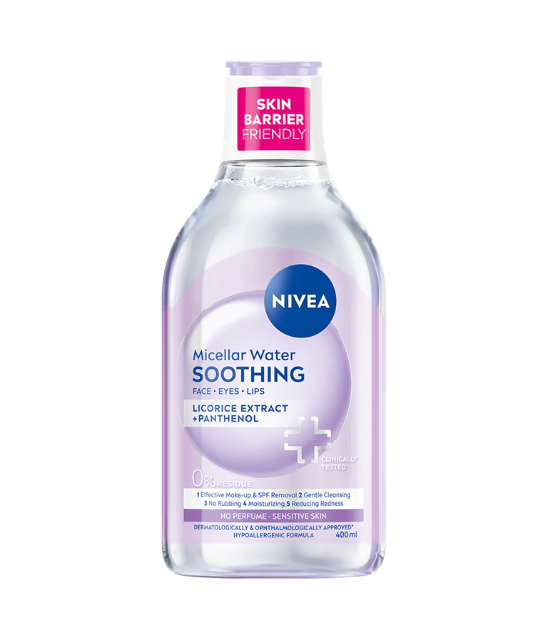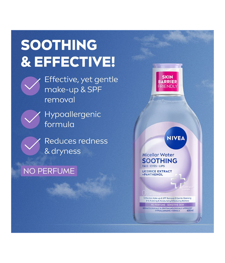 NIVEA Soothing Micellar Water är ett micellärt vatten berikat med lakritsextrakt, panthenol och aminosyrakomplex som tar bort make-up, smuts och SPF, rengör, återfuktar och lugnar huden samtidigt som den minskar rodnad och torrhet, vilket gör den perfekt för känslig hud.