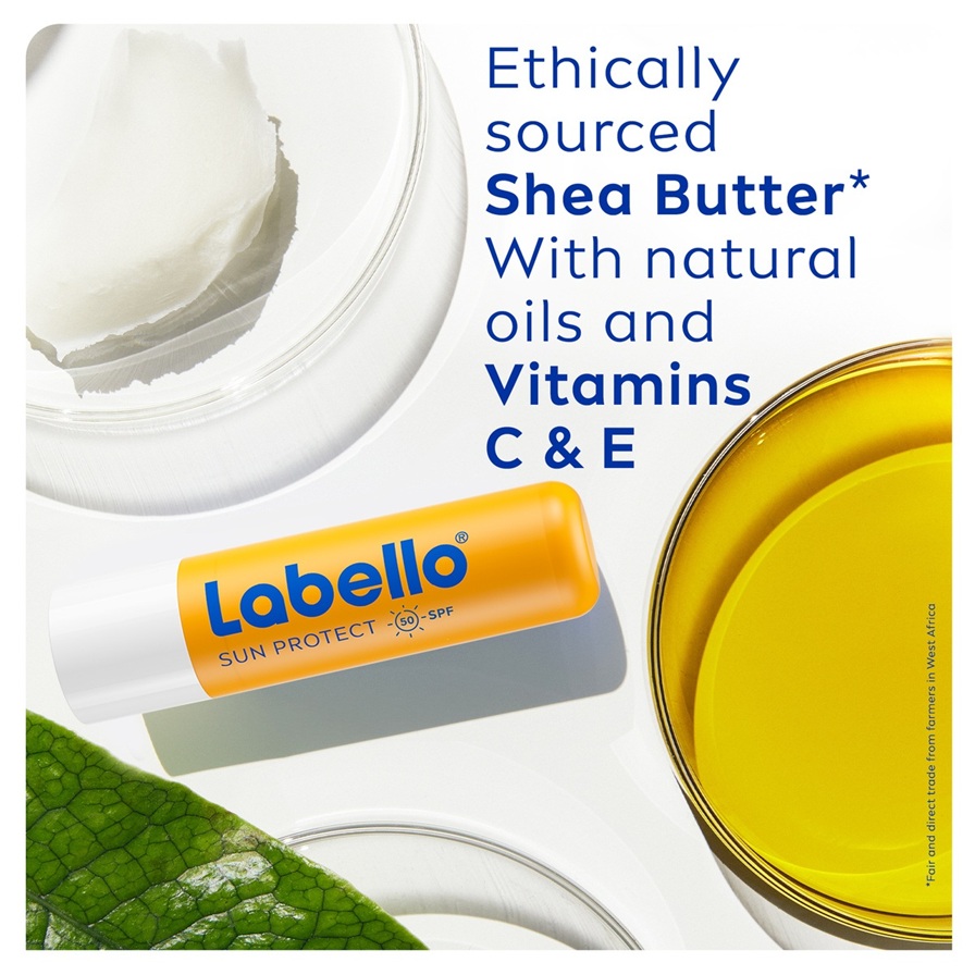 Labello Sun Protect Lip Balm med SPF 50 skyddar intensivt dina läppar mot UVA/UVB-strålar samtidigt som formulan håller dina läppar återfuktade i 24 timmar. Formula med naturliga oljor och Sheasmör som smälter omedelbart på dina läppar!