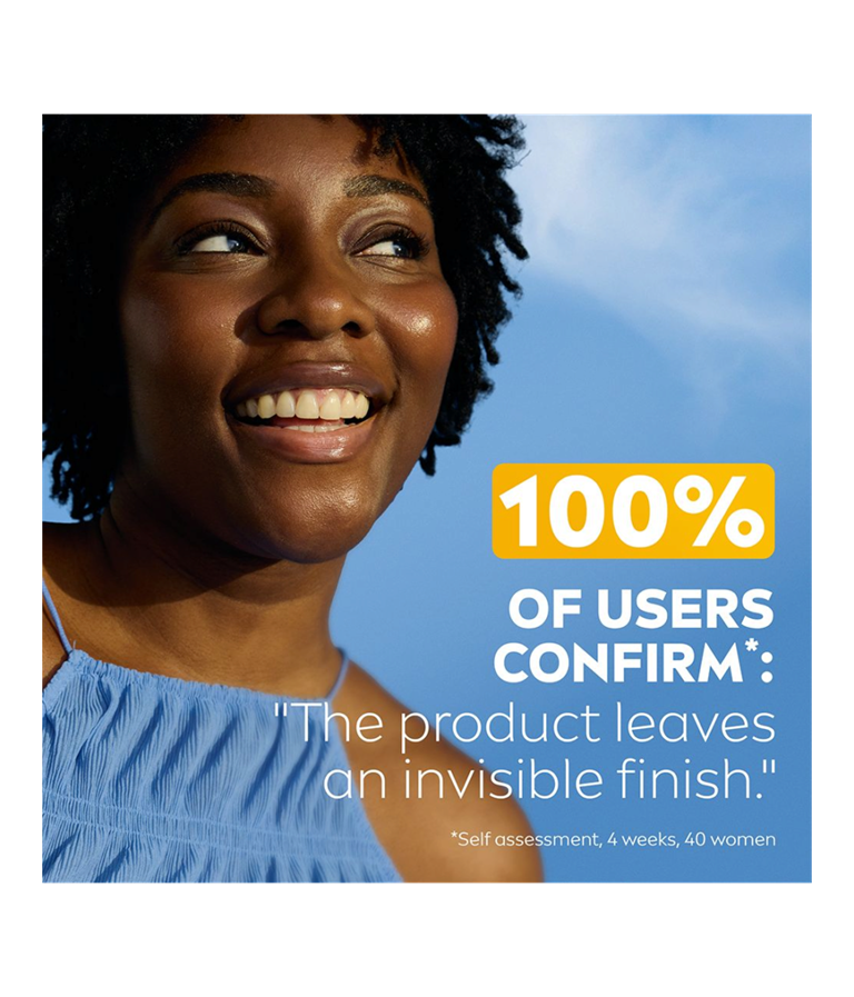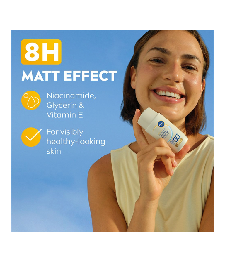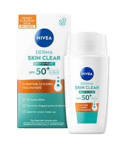 NIVEA UV Face Invisible Daily Fluid SPF 50+ är en solkräm för ansiktet med SPF 50+ som ger ett omedelbart skydd mot UV-strålar och fotoåldrande. Formulan innehåller Niacinamid som motverkar tilltäppta porer och blemmor, utan att lämna en klibbig hudkänsla.