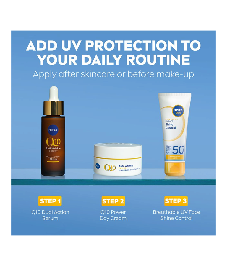 NIVEA UV Face Shine Control SPF 50+ ä ren SPF framtagen specifikt för att ge ett mycket högt skydd åt dig med oljig hud. Dessutom minimerar den porer och balanserar oljenivåer i över 12 timmar. Med 98% skydd mot UVB-strålar och fotoåldrande är den perfekt för daglig användning.