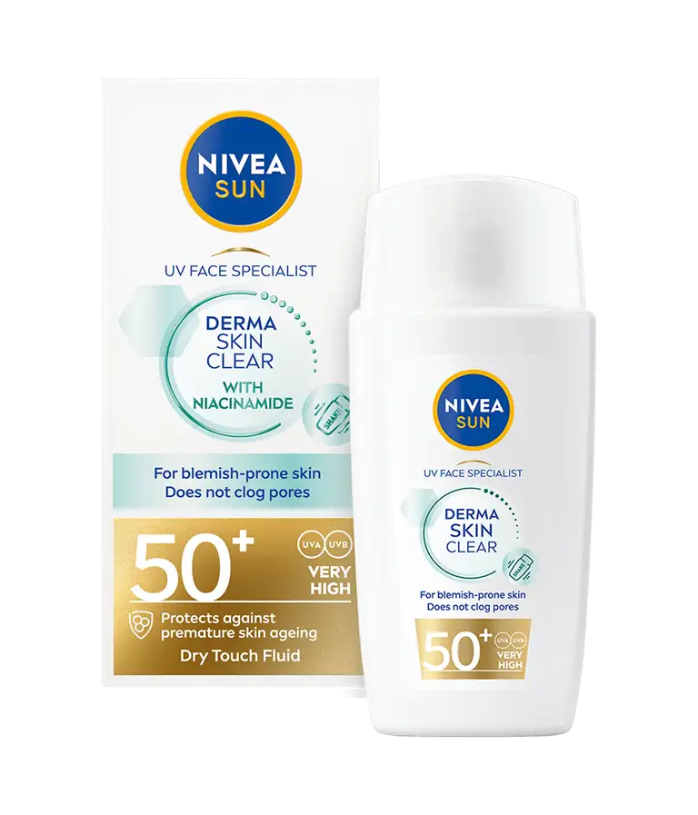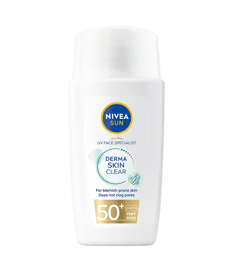 NIVEA SUN UV Face Specialist Derma Skin Clear är en solkräm för ansiktet med SPF 50+ som ger ett omedelbart skydd mot UV-strålar. Formulan innehåller anti-blemish komplex och Niacinamid som motverkar tilltäppta porer och blemmor, utan att lämna en klibbig hudkänsla.