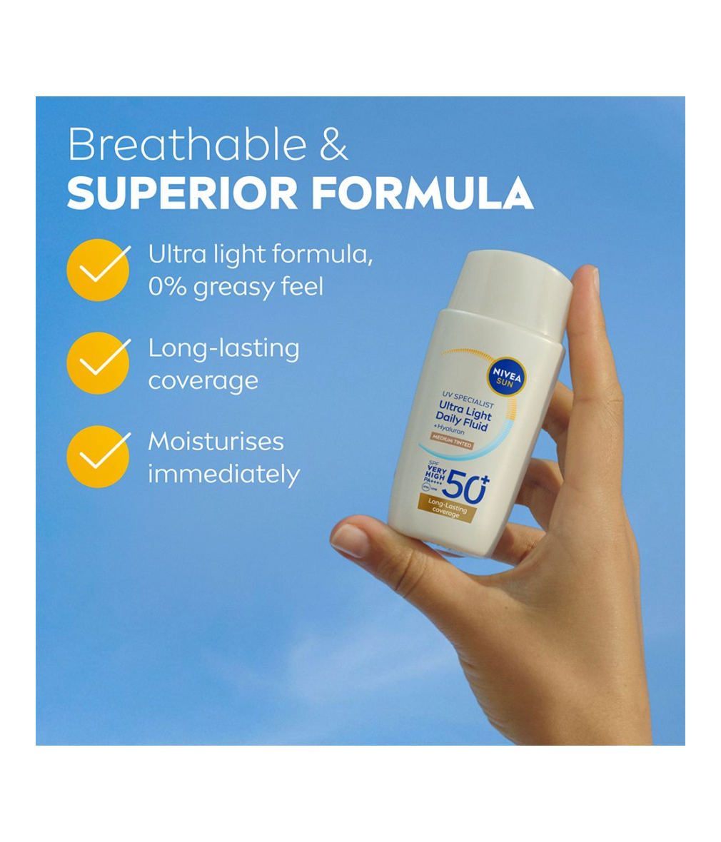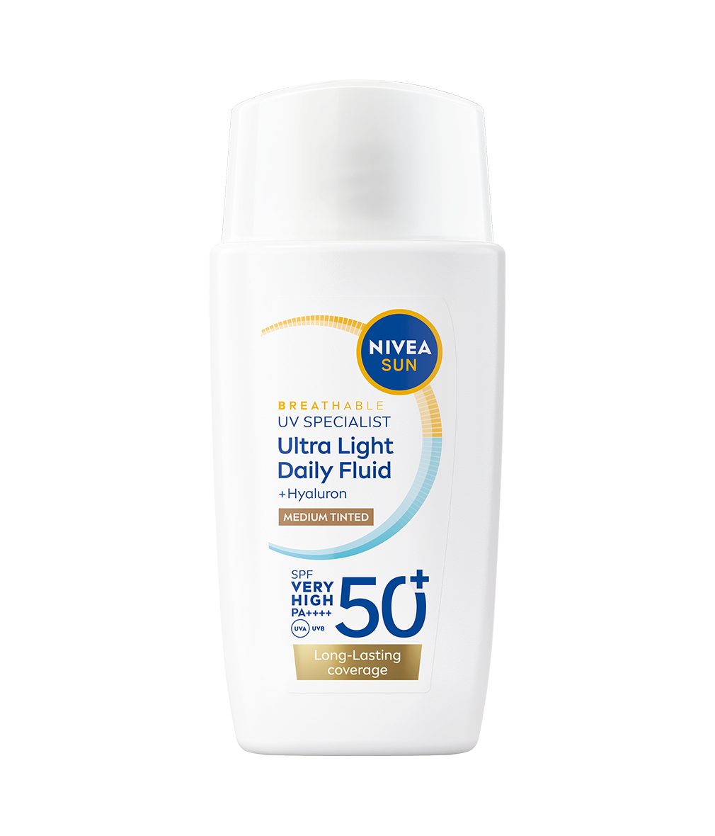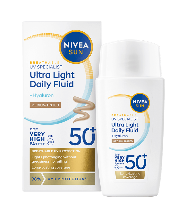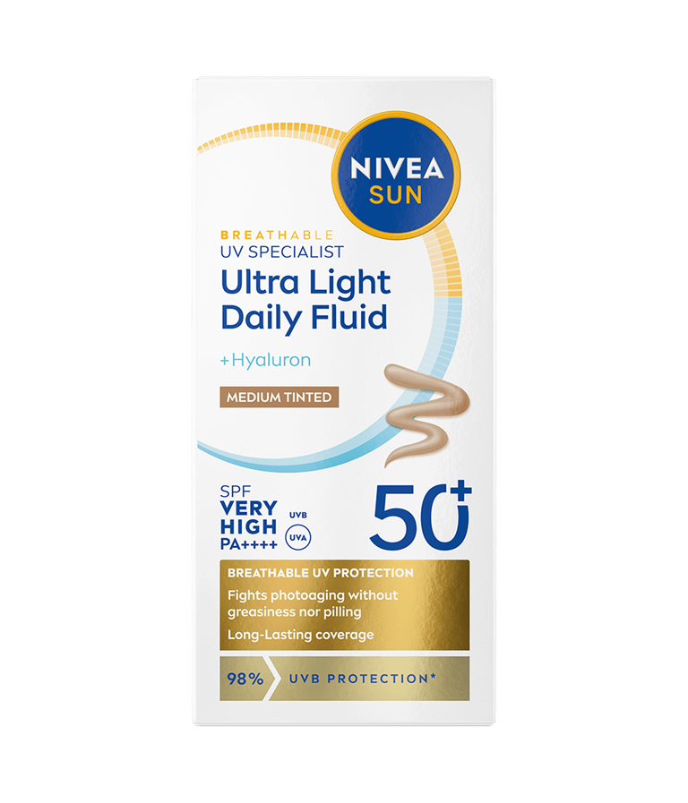 NIVEA UV Face Specialist Ultra Light Daily Fluid, Medium Tinted SPF 50+ är en solkräm med SPF 50+ som ger ett omedelbart mycket högt solskydd. Solkrämen är återfuktande och färgat för en jämn och naturlig, långvarig täckning.