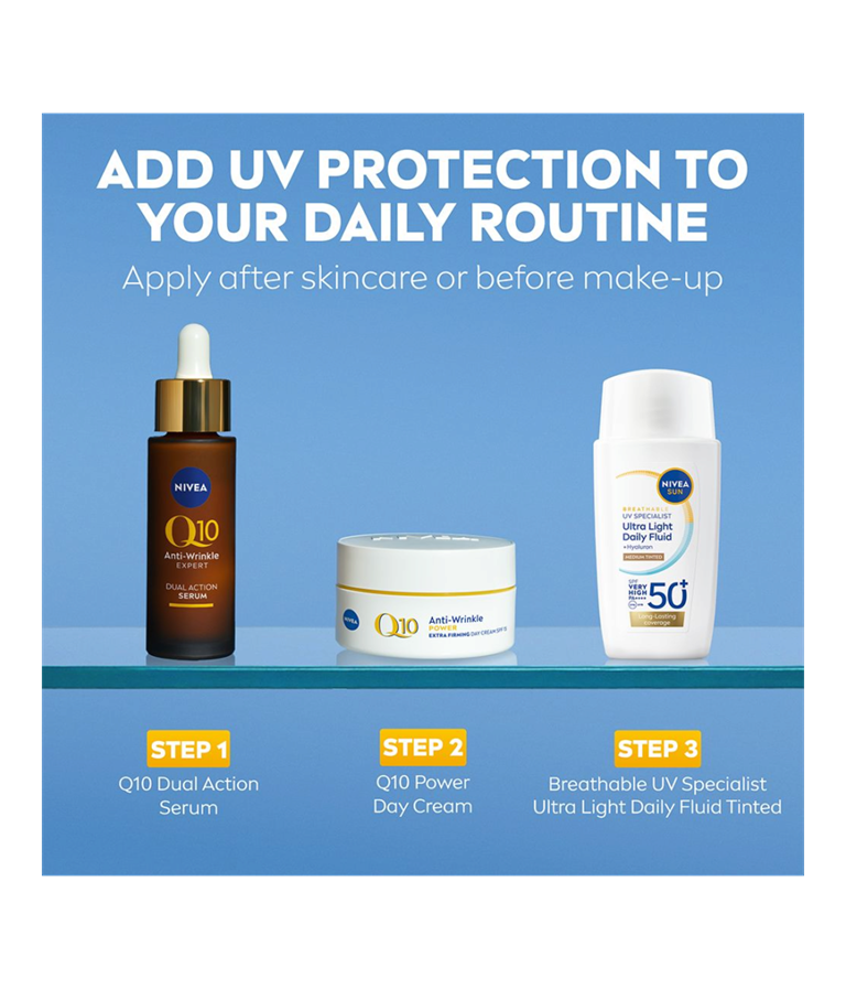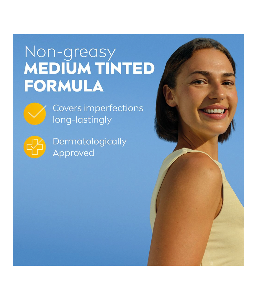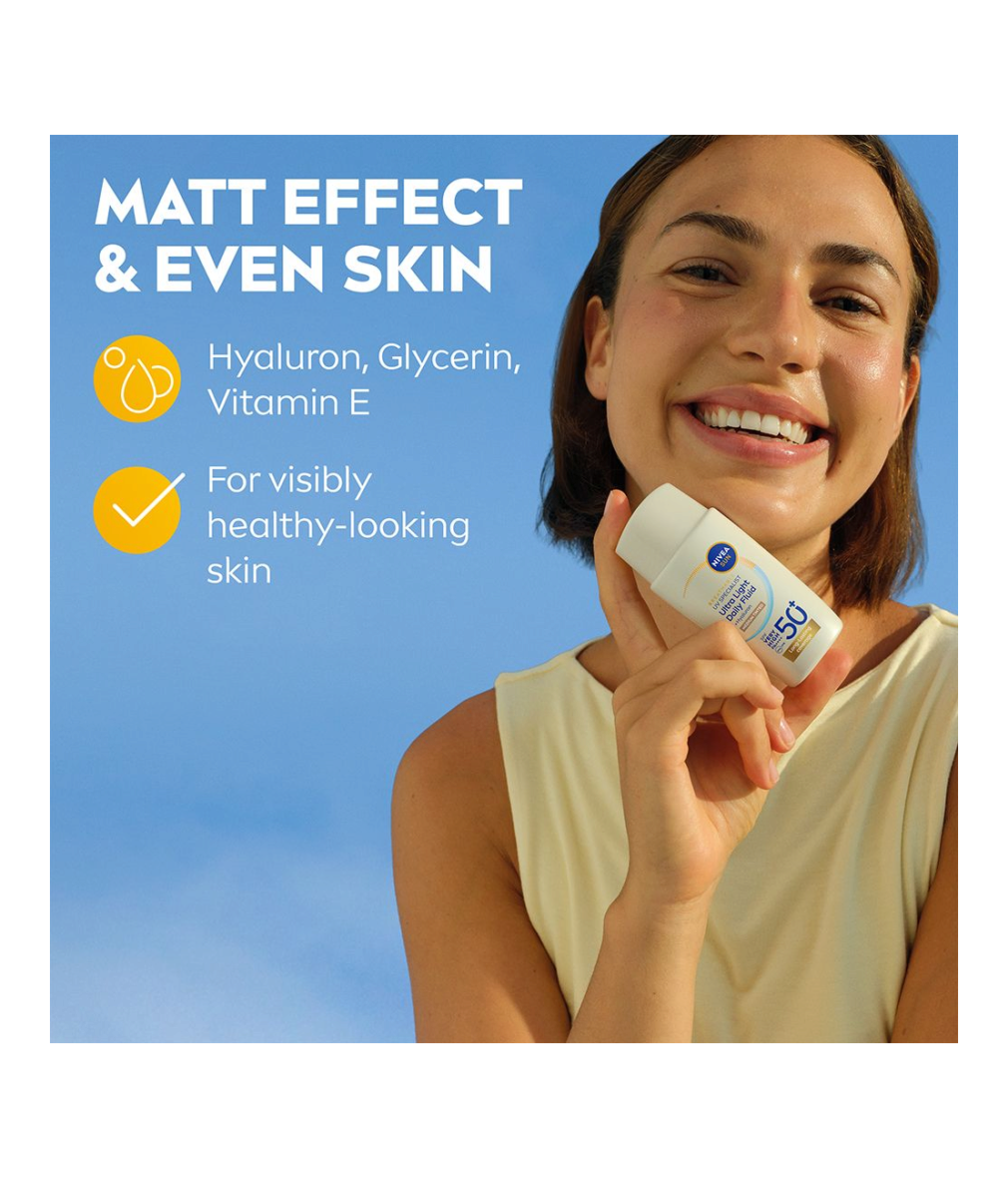 NIVEA UV Face Specialist Ultra Light Daily Fluid, Medium Tinted SPF 50+ är en solkräm med SPF 50+ som ger ett omedelbart mycket högt solskydd. Solkrämen är återfuktande och färgat för en jämn och naturlig, långvarig täckning.
