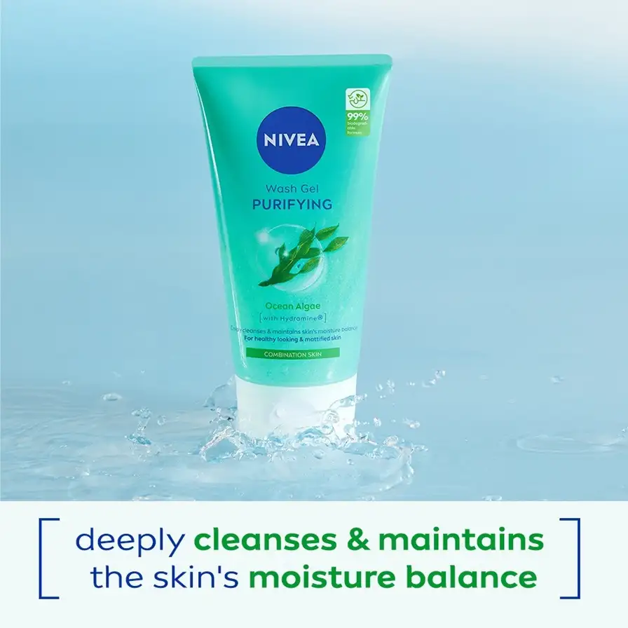 NIVEA Wash Gel Purifying är en rengöringsgel som är berikad med hydramin och havsalger. Rengör på djupet, minskar orenheter och förfinar porerna. Den minskar överskott av talg och mattar ner huden samtidigt som den bibehåller hudens naturliga fuktbalans.