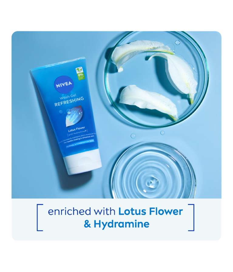 NIVEA Wash Gel Refreshing är en rengöringsgel som är berikad med hydramine och lotusblomma. Den tar inte bara bort dagliga orenheter, utan piggar också upp huden samtidigt som den bibehåller sin naturliga fuktbalans.